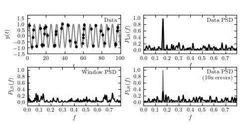 window function (PSD of sampling times) is shown in the bottom-left panel.